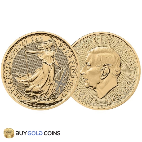 The Gold Britannia Coin has two different designs. One side of the coin shows either Queen Elizabeth II or King Charles III, depending on the edition. The words around the portrait tell you the coin's value and year it was made. On the other side of the coin, you'll find Lady Britannia, a symbol of Britain's strength and spirit.